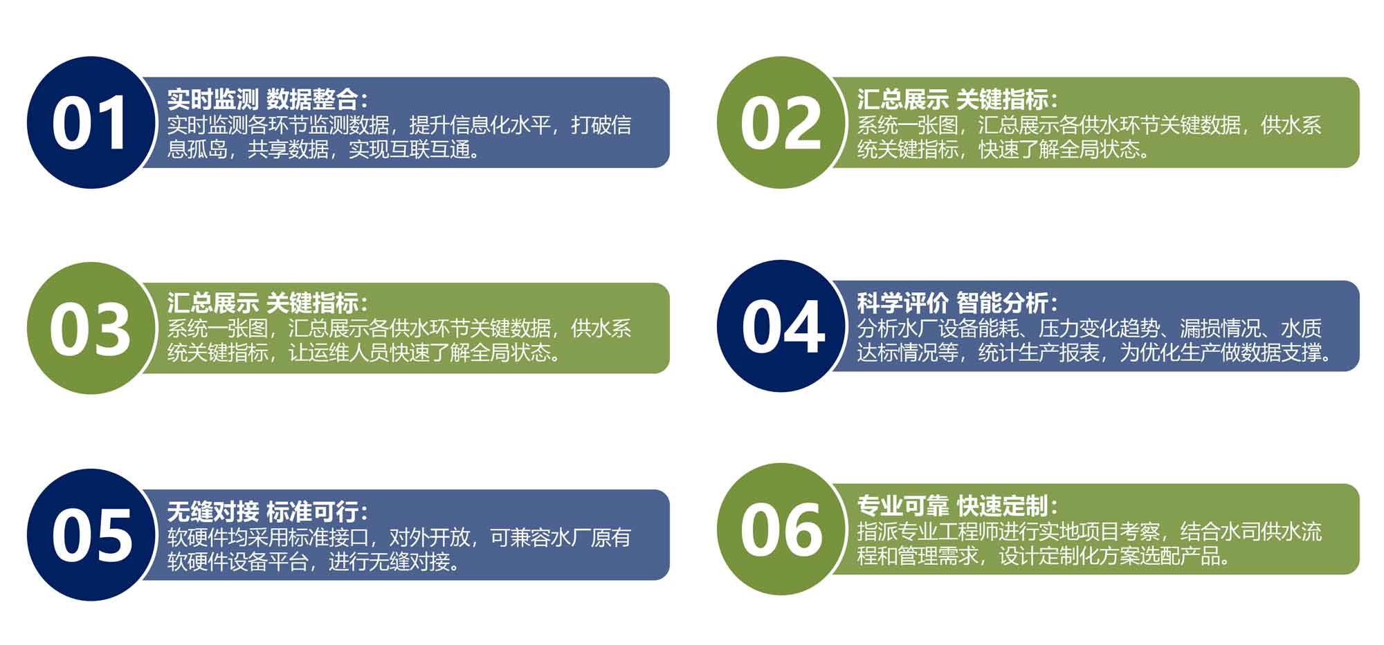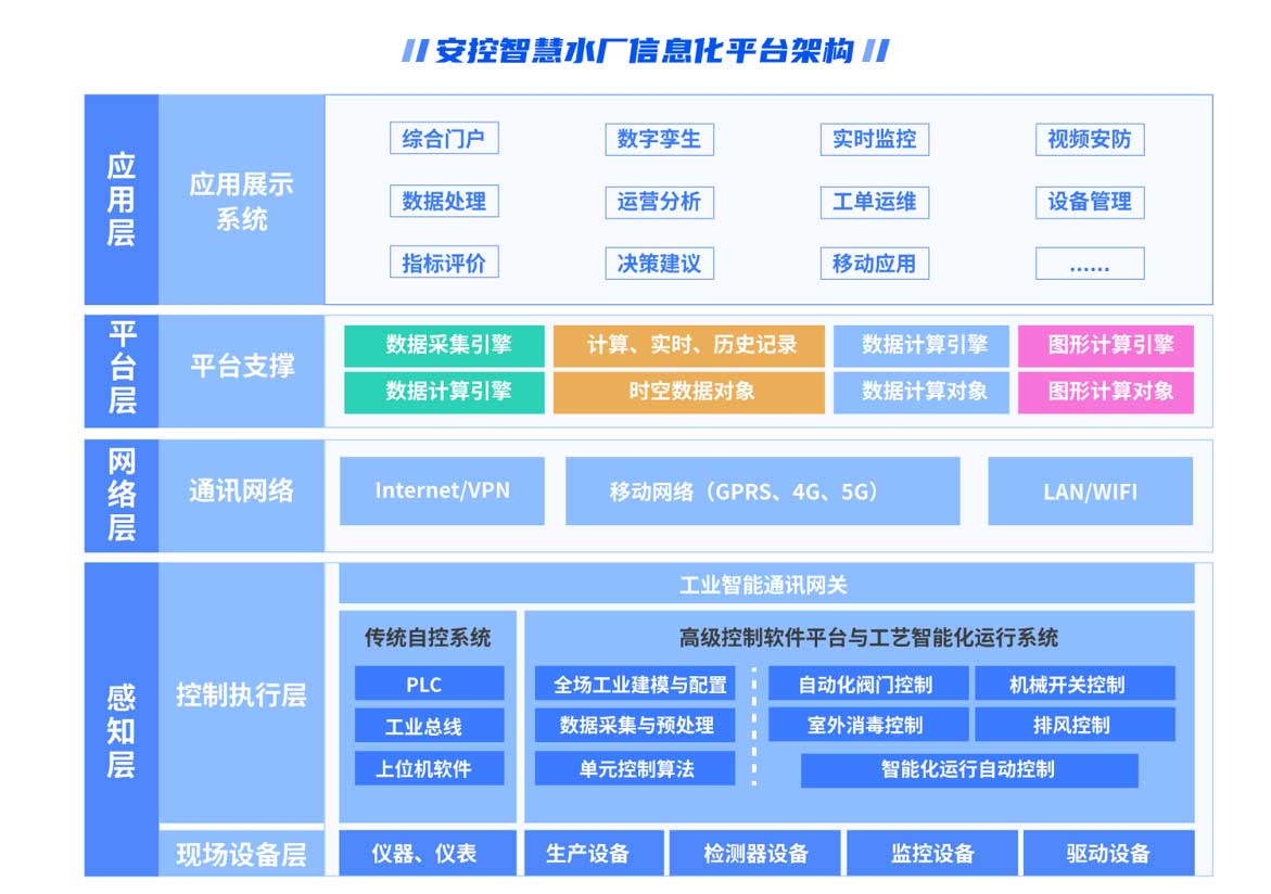 安控智慧水厂信息化系统支持海量物联网数据接入实现供水全流程信息化;深度逻辑运算+自动控制实现供水调度智慧化;融入管网地理信息系统实现测点数据时空化;组态界面实现水厂各工艺环节运行情况可视化;多角度统计分析实现水务运营管理精细化;提升供水服务质量,保障高效可靠供水,促进节能降耗,降低产销差,提高经济和社会效益。实现水厂信息化、自动化、智能化管理,全方位保障水厂正常运行,提高生产效率,降低运行能耗,辅助智慧决策。